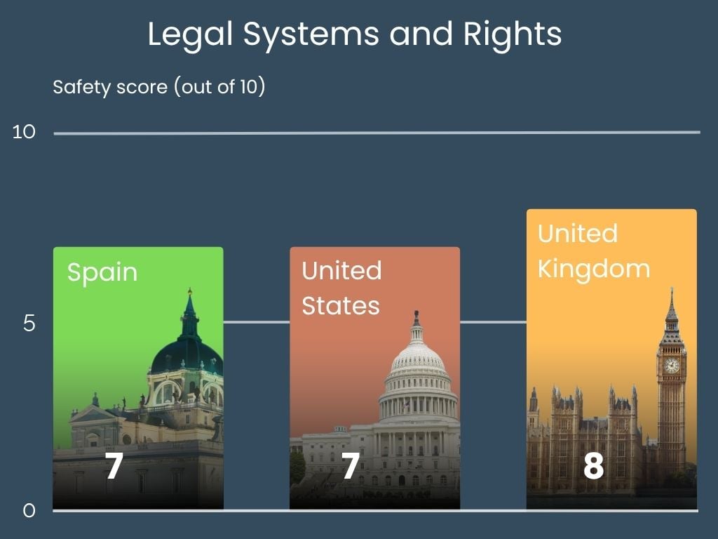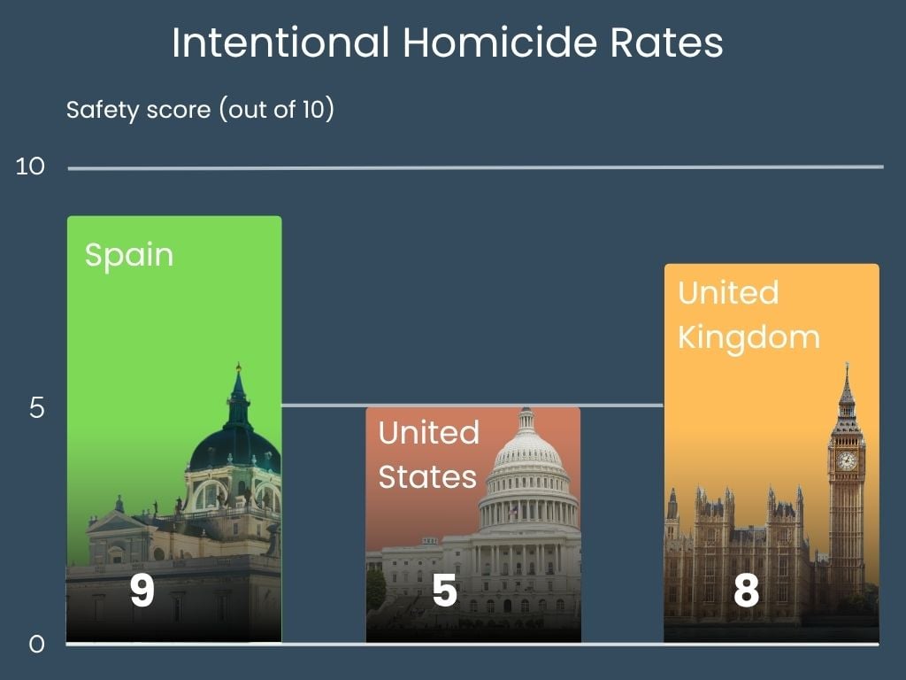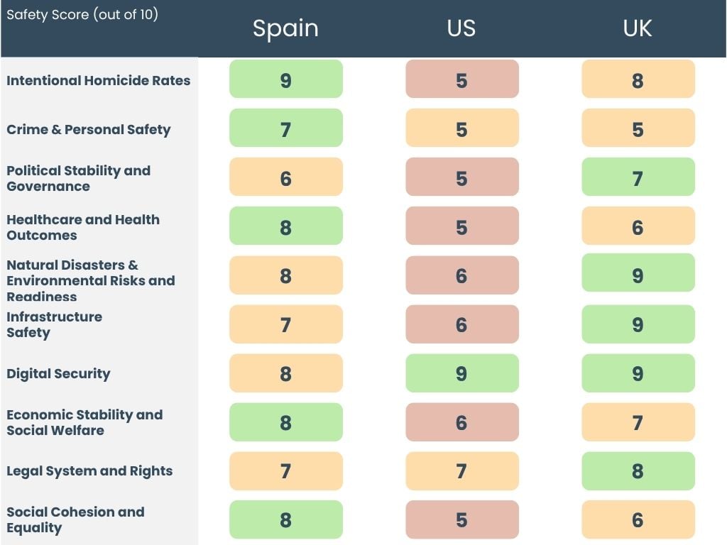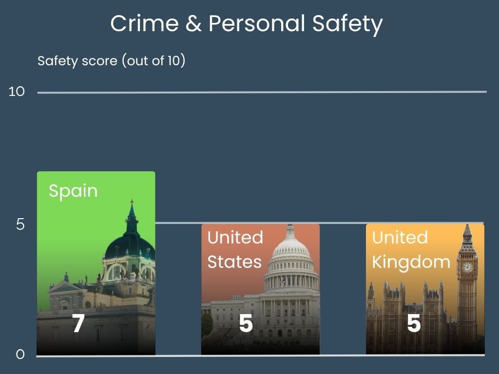 Our analysis assesses Spain as a significantly safer country to live in than the US. Interestingly, while Spain scores better than the UK, the difference is marginal.