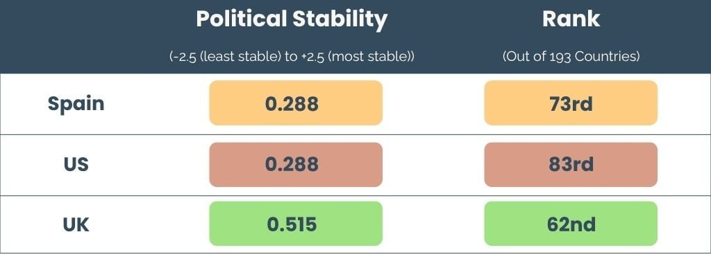 Spain’s regulatory quality ranks 35th globally, highlighting its efforts to create a predictable business environment while reducing bureaucratic burdens. These measures contribute to economic stability, which is closely tied to political stability.