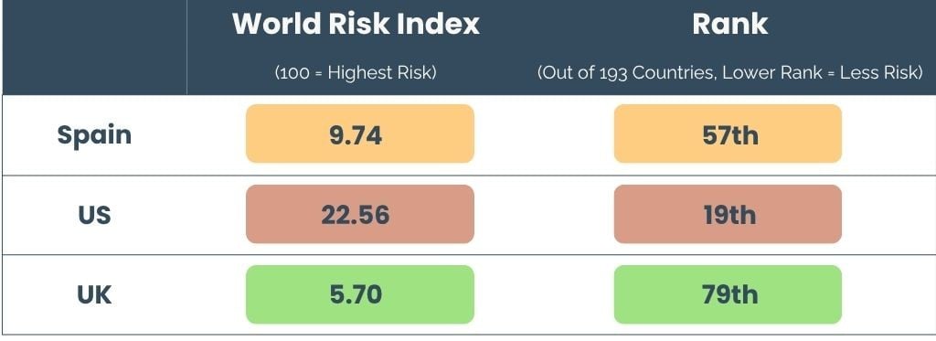 This data gives us our assessment of how safe each country is, in the context of what US and UK folk looking to move to Spain consider safe. It is an attempt to quantify the relative performance of Spain across the safety parameters compared to the US and the UK.