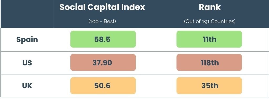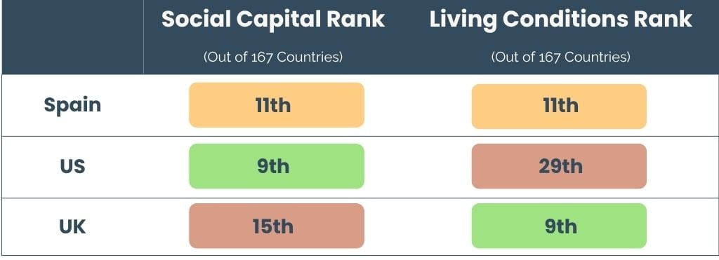 According to the 2023 Legatum Prosperity Index, Spain ranks 24th globally for overall prosperity out of 167 countries, with particular strengths in living conditions (11th) and social capital (11th).