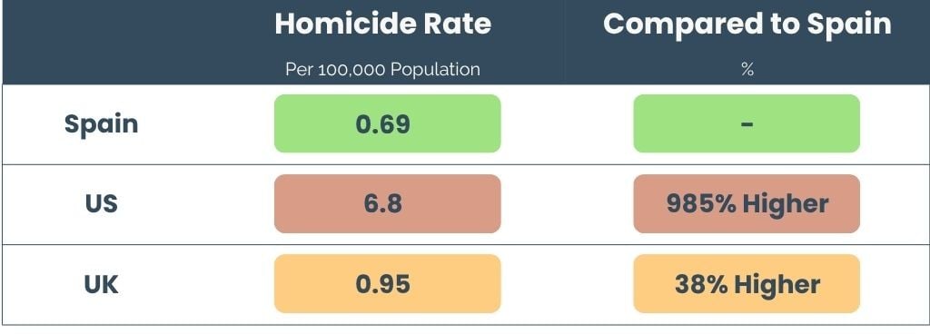 Spain has lower violent crime rates than many European countries and the US. According to the 2024 Global Peace Index, Spain ranks 29th out of 163 countries globally. The homicide rate is approximately 0.69 per 100,000 inhabitants, significantly lower than the EU average (1.0) and far below the US rate of 6.8. The UK rate is 0.95.
